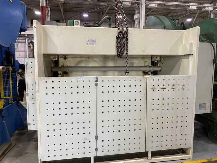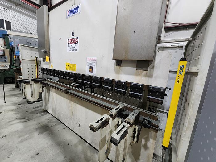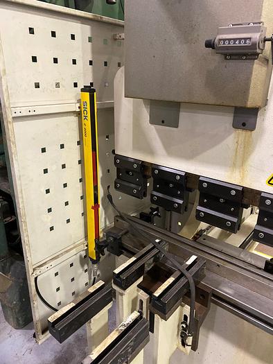 The 2005 Ermak AP-10X88 is a used hydraulic press brake with a capacity of 88 tons, suitable for various bending applications. It features a motor power of 10 HP and operates at a voltage of 600 volts, providing the necessary power for efficient performance. The press brake is designed with an approach speed of 3.15 inches per second, ensuring quick and precise movements during operation. In terms of dimensions, the press brake measures 137.8 inches in length, 85.8 inches in width, and 106.3 inches in height, with a total weight of 14,994 lbs. It includes a safety distance specification of 59 inches, prioritizing operator safety during use. The machine also carries an IP rating of 54, indicating decent protection against dust and splash water. Given its reliable build and substantial production capabilities, the Ermak AP-10X88 press brake is a robust choice for businesses in need of durable and efficient metal forming machinery. It maintains the hallmark of quality associated with Ermak products and is suitable for heavy-duty tasks.