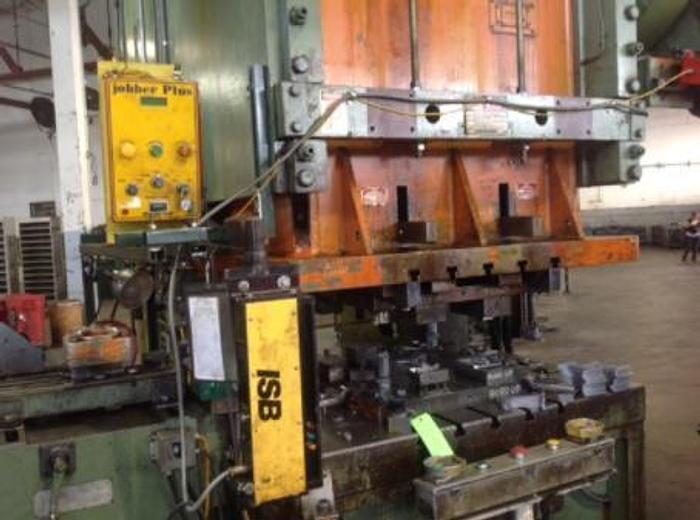 The 1970 NIAGARA SG2-200-60-42 is a used 200-ton double crank gap press, a robust machine ideal for heavy-duty industrial applications. It includes a T-slotted bolster and ram for secure die placements, enhancing precision and stability during operations. The press features an air clutch and brake system, providing smooth and responsive control, and air counterbalances to minimize slide wear and enhance performance. With a stroke length of 8 inches and stroke rate adjustable between 30 to 60 strokes per minute, this machine is versatile for various pressing tasks. The shut height measures 30 inches with a slide adjustment of 10 inches, offering flexibility to accommodate different workpiece sizes. The spacious bed area of 60 inches by 42 inches supports large metal sheets, making it suitable for diverse manufacturing processes. Safety features include a palm button stand and light curtains for operator protection, while the pneumatic cushion offers additional die protection and material feed assistance. Overall, this Niagara press is a dependable and adaptable choice for manufacturers seeking reliable performance in their metalworking operations.