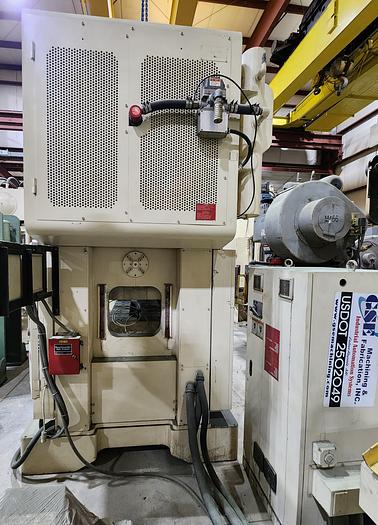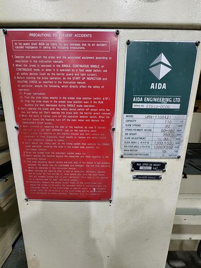 The 2004 AIDA UMX-1100(2) is a used straight side mechanical press with a capacity of 110 tons. Designed for precision and efficiency, it operates at speeds ranging from 60 to 180 strokes per minute. The press features a die height of 13.77 inches, a slide area measuring 47.24 inches by 20.47 inches, and a bed area of 47.24 inches by 21.65 inches, making it suitable for various industrial applications. This model is equipped with a range of WINTRISS systems, including the SmartPac, AutoSetPac, and programmable cam outputs, enhancing its functionality and ease of use. Safety and convenience are prioritized with a dual palm button station, and the equipment includes a T-slotted ram and bolster for versatile mounting options. The press requires 5 KGF of air pressure, and its main motor is rated at 15 kW, ensuring robust performance. Additional specifications include a stroke length of 3.14 inches, a slide adjustment of 1.18 inches, and window dimensions of 17.5 inches in width by 17 inches in height. This press is ideal for operations requiring reliability and precision, providing a comprehensive solution for diverse manufacturing needs.