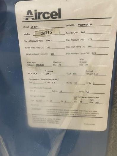 The AIRCEL VF-800 Air Dryer is a reliable unit designed to efficiently remove moisture from compressed air systems. This used model, identified by serial number V1SLWD4794, operates at a rated pressure of 100 PSI. It is capable of handling a flow rate of 800 SCFM, making it suitable for a variety of industrial applications that require consistent and dry air output. Its robust design ensures durability and longevity, even in demanding environments. This air dryer provides efficient performance, maintaining the integrity and functionality of your compressed air systems by mitigating moisture-related issues and protecting downstream equipment. The AIRCEL VF-800 is an excellent choice for businesses looking to enhance their air system's efficiency without the higher investment cost of new equipment. With its operational specifications, the VF-800 stands as a practical solution for maintaining clean, dry air flow, essential in various production processes. Whether you're addressing pneumatic tool operation or safeguarding equipment from moisture-related damage, this air dryer offers a reliable and economical option.