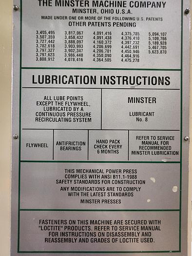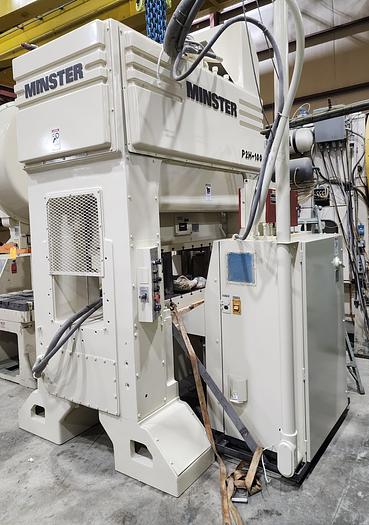 The Minster P2H-100 Straight Side Press is a robust unit known for its reliability and efficiency in industrial applications. This used mechanical press boasts a capacity of 112 tons, ideal for handling heavy-duty tasks with precision. Its bolster measures 48 inches left-to-right and 31.5 inches front-to-back, offering ample space for diverse operations. Featuring a stroke length of 3.94 inches and the ability to deliver up to 250 strokes per minute, this press is designed for consistent performance. The slide adjustment and shut height, ranging from 11 to 14.94 inches, provide versatility for different project requirements. Weighing 41,000 lbs, the press ensures stability and durability during operation. This model's dimensions are 86 inches in width, 70 inches in depth, and 155 inches in height, making it a substantial piece of equipment suitable for larger facilities. Its substantial build and impressive capabilities make it an excellent choice for those requiring reliable and efficient press solutions.