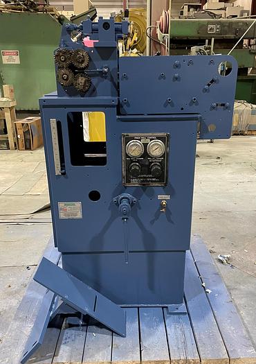 The Minster Model MEF4-14S Feeder is a used, standalone feed line equipment designed for precision handling of stock materials. This feeder is equipped with a servo drive and a PLC, providing reliable and efficient operations. It is capable of handling materials with a maximum stock width of 14 inches and supports a range of stock thickness from as thin as 0.020 inches to a maximum of 0.250 inches. For optimal performance at full material width, it accommodates stock thickness up to 0.152 inches and supports a maximum width of 5.53 inches at full thickness. This device ensures consistent feeding with up to 400 roll lift strokes per minute. An added feature is its roll opening capacity of 0.300 inches, allowing easy threading of materials. This feeder includes a motor and is identified by serial number 18-50992. A reliable choice for industries requiring precise and high-speed feeding operations, this Minster feeder offers solid performance and adaptability to varying material dimensions.