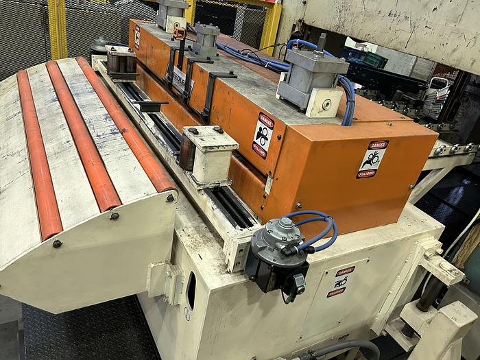 The 2016 66" x 40,000 lb Feedlease Servo Roll Feed Line is a reliable and robust coil feed system for high-speed blanking. It features essential components like a cabinet-mounted servo roll feed, a nine-roll powered straightener, and it can support a coil weight of up to 40,000 lbs with a stock width of 66". This machine handles coil diameters from 20" to 72" and manages Thicknesses ranging from .020" to .090", with a line speed capability of 10-200 feet per minute. Operating on 460V, 3-phase, 60Hz, this equipment requires a minimum air supply of 80 psi. The feed occurs right to left, and the pass line is 60" above the floor. It delivers feed accuracy within +/- .003" and accommodates feed lengths up to 999.999", with a quick acceleration time of .200 seconds. Its 20:1 gear ratio and 300 in/lbs drive force ensure efficient performance. This feed line is specifically suited for high-speed applications, maintaining maximum stock thickness with pre-painted material up to .090" at full width, offering versatility for various manufacturing demands.