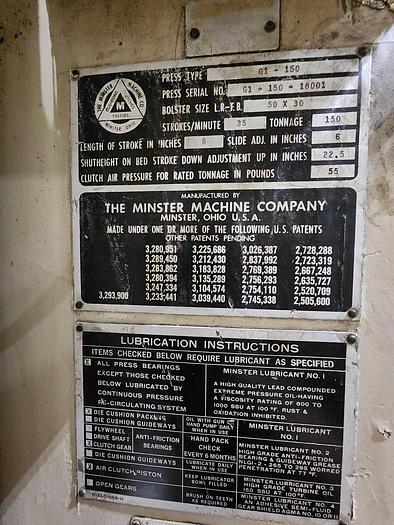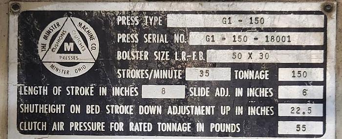 The 150 Ton Minster Model G1-150 Gap Frame Press is a robust and reliable piece of equipment ideal for various industrial applications. With a bolster area of 50" LR x 30" FB, this press provides ample space for handling large pieces of material. Operating at 35 strokes per minute, the G1-150 is designed for efficiency and precision. Key specifications include a 150-ton capacity and an 8" length of stroke. The slide adjustment feature measures 6", while the shut height on bed (SDAU) stands at 22.5". This used press is sold "as is, where is," making it a valuable addition for those seeking a high-capacity press without compromising on quality.