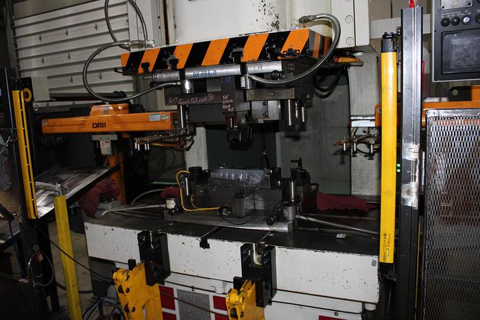 The AIDA MODEL NC1-2000(2)E is a used gap frame press designed with a 220-ton capacity, suitable for a variety of industrial applications. It features a slide stroke of 9.84 inches and operates at speeds between 25 to 50 strokes per minute. The slide adjustment of 4.33 inches ensures precision in forming processes, providing the necessary flexibility for different production needs. This machine is equipped with a die height of 17.72 inches, supporting diverse tooling setups. The slide area measures 34.6 x 25.6 inches, while the bolster area is a spacious 54.7 x 33.1 inches, allowing it to accommodate various workpieces efficiently. The hydraulic die clamping further contributes to its operational capability, enhancing ease of use through secure clamping. Overall, the NC1-2000(2)E is a reliable choice for manufacturers seeking a robust and consistent performance in their production processes. Its generous space and precise adjustments make it a cost-effective addition for enhancing production capabilities, supported by the reputation and quality of Aida machinery.